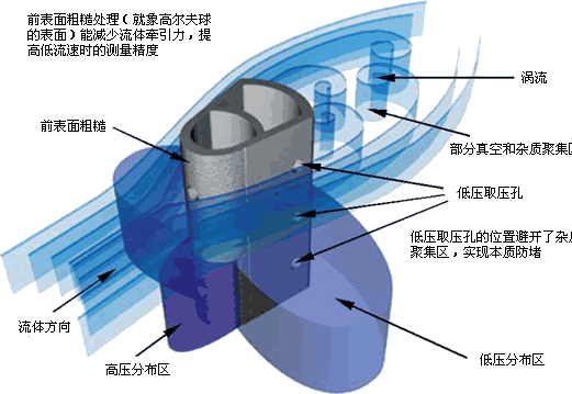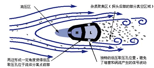 探頭的前部形成高壓區,壓力略高于管道靜壓,阻止了顆粒進入。請注意:在探頭的高壓取壓孔處流體的速度是零,沒有物體會進入取壓孔。