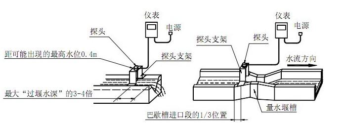 超聲波明渠流量計的探頭可以直接安裝在量水堰槽水位觀測點的上方。探頭發聲的一面要對準水面。可以用水平尺放在探頭上蓋上,通過校上蓋水平使探頭對準水面。巴歇爾槽水位觀測點在距喉道2/3收縮段長位置(如下圖的La);三角堰、矩形堰在上游一側,距堰板3~4倍大過堰水深處。(如下圖)