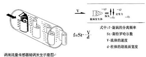 一定雷諾數(shù)范圍內(nèi)(2×104~7×106 ),旋渦的釋放頻率f與流體流速V及旋渦發(fā)生體的迎流面寬度d之間關(guān)系式為f=St•v/d,式中St為斯特勞哈數(shù),它是一個(gè)無(wú)量綱的系數(shù),只要準(zhǔn)確測(cè)出頻率f,就可以求得流體流速v,由v求出體積流量。