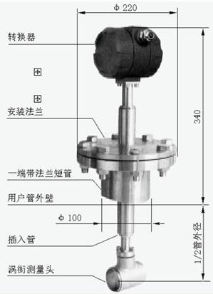 將渦街測(cè)量頭插入管道特定位置,通過(guò)測(cè)量該位置的局部流量,根據(jù)管道截面流速分布關(guān)系,計(jì)算出管道內(nèi)平均流速值。它由轉(zhuǎn)換器、插入桿組件、球閥(根據(jù)需求配 )、安裝短管(ф100)、渦街測(cè)量頭等組成。