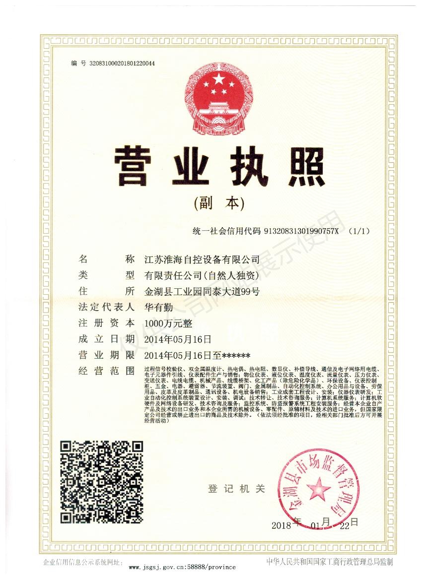 營業執照-榮譽資質-江蘇淮海自控設備有限公司-精雕細琢 精益求精--傳承工匠精神 成就淮海品質