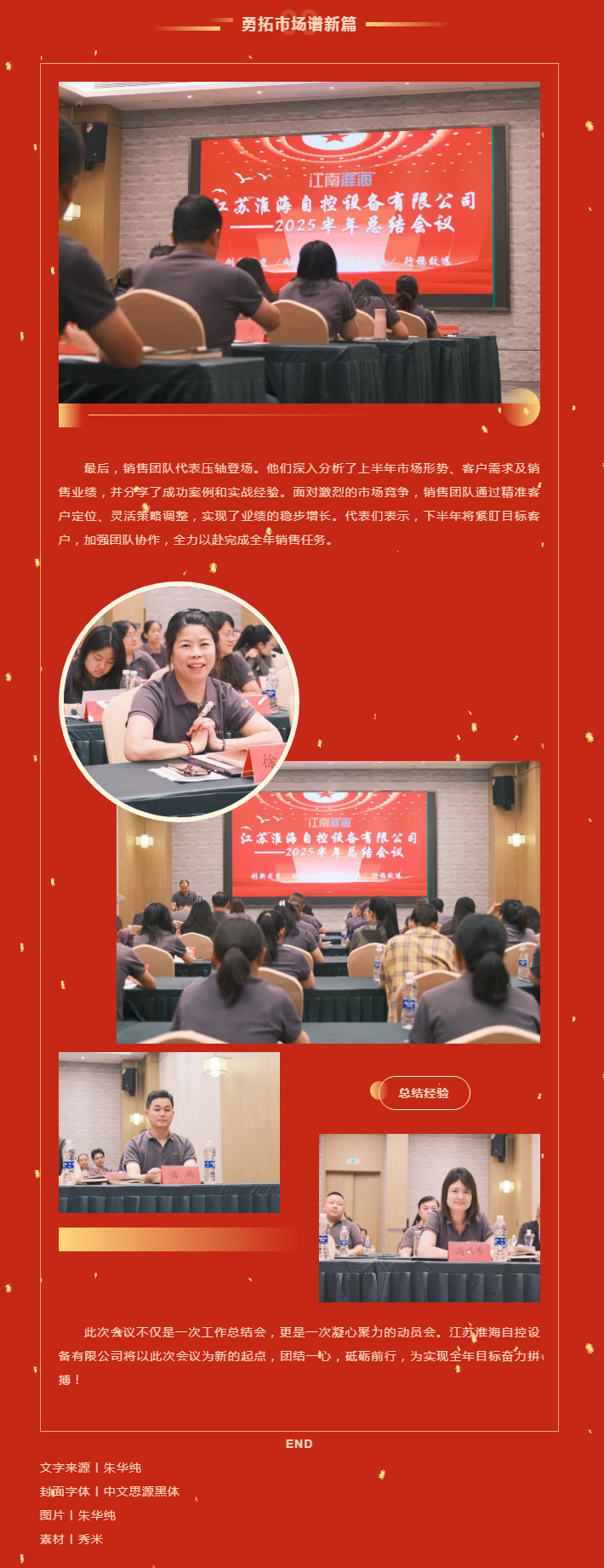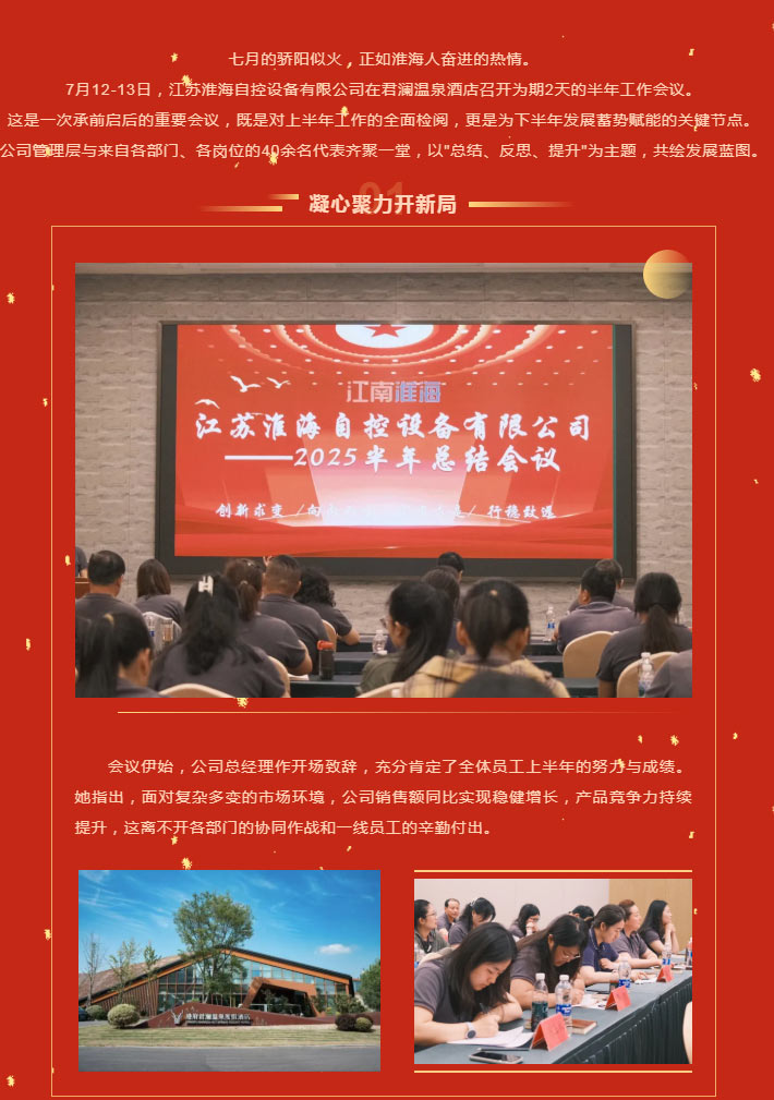 江蘇淮海自控設備有限公司2025年半年總結會議順利召開!7月12-13日,江蘇淮海自控設備有限公司在君瀾溫泉酒店召開為期2天的半年工作會議。這是一次承前啟后的重要會議,既是對上半年工作的全面檢閱,更是為下半年發展蓄勢賦能的關鍵節點。公司管理層與來自各部門、各崗位的40余名代表齊聚一堂,以"總結、反思、提升"為主題,共繪發展藍圖。